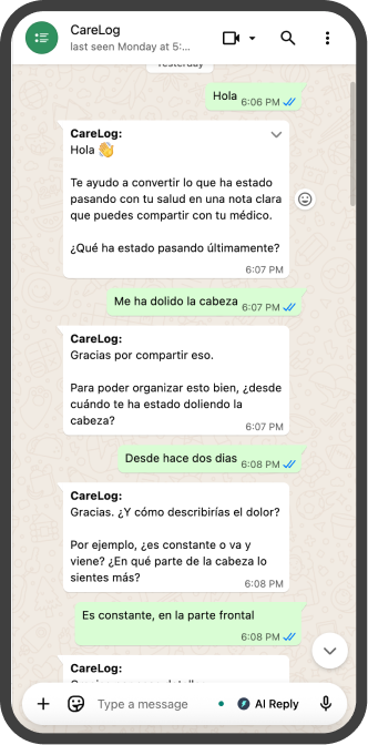 From simple WhatsApp messages to a clear document your doctor can review.